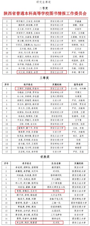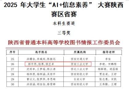 近期,2025年大学生信息素养大赛陕西赛区省赛获奖名单正式公布,我校参赛队伍表现卓越、成绩斐然。此次大赛,我校共有6支队伍参赛,其中本科生队凭借扎实的专业素养夺得三等奖;研究生队伍更是气势如虹,在激烈的竞争中,荣获1个二等奖、2个三等奖以及2个优胜奖,充分彰显了我校学子在信息素养领域的实力。