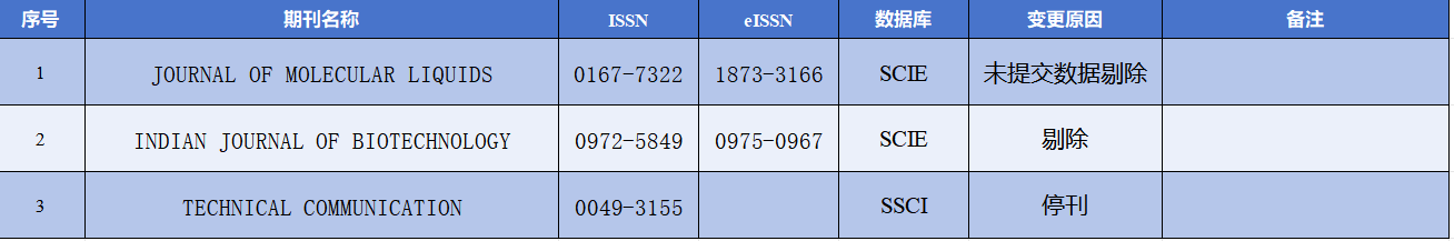 2025年12月15日,科睿唯安更新了Web of Science核心期刊目录。本次更新的SCIE期刊目录共包含9449本期刊,SSCI期刊目录共包含3541本期刊。与上期相比共有3本期刊发生变更: