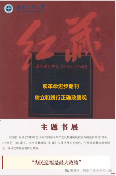 为深入贯彻落实关于树立和践行正确政绩观学习教育要求,图书馆以《红藏:进步期刊总汇(1915—1949)》为载体,打造——读革命进步期刊:树立和践行正确政绩观主题书展。