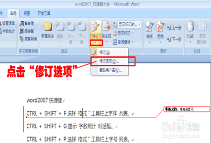 2.点击工具栏中“审阅”找到“修订”,在修订工具下方找到小箭头并点击,出现下拉菜单,选项“修订选项”,如图所示。